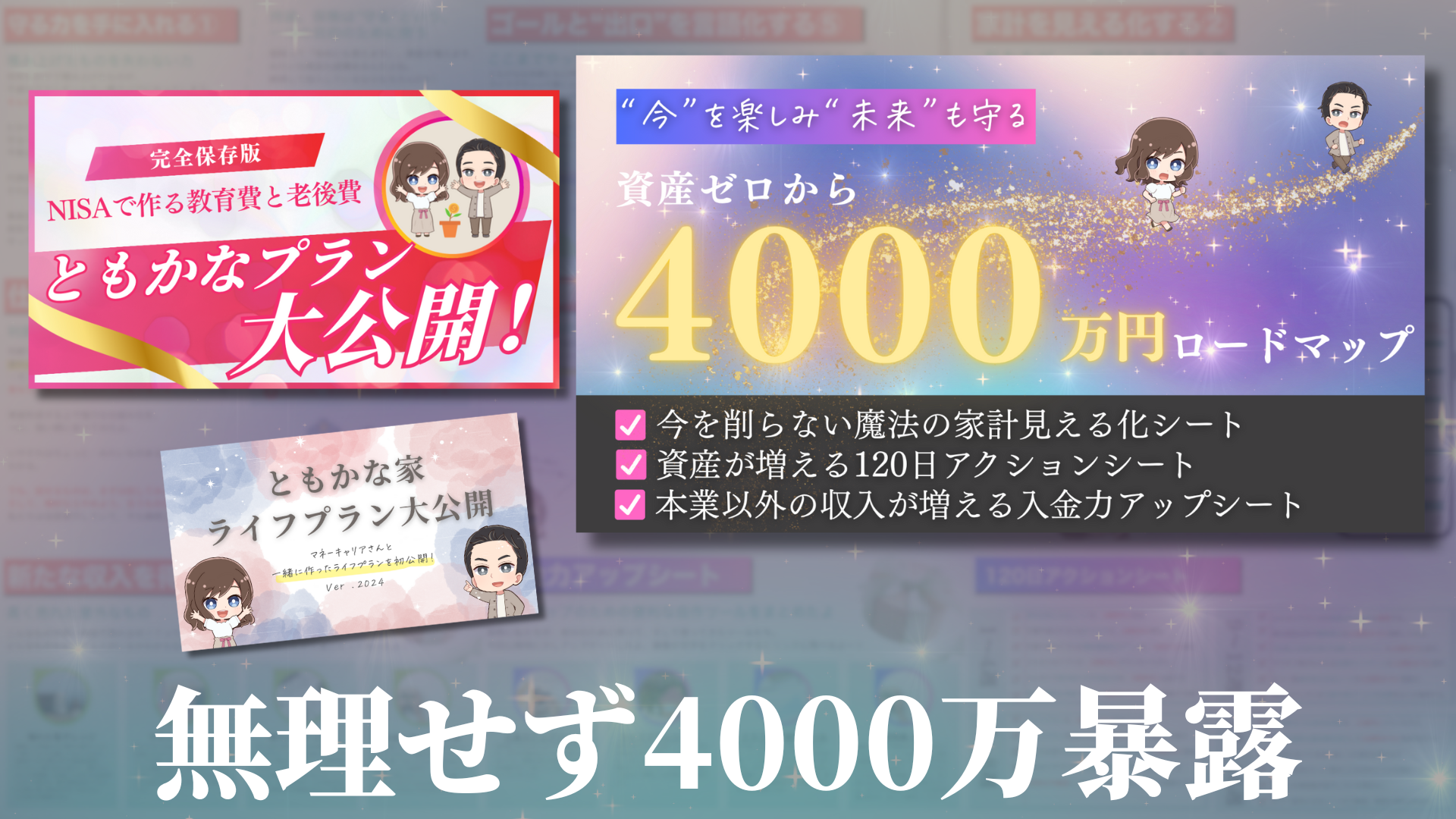 今回、4,000万円のロードマップに加えて新作資料【完全保存版】NISAで作る教育費・老後資金、ともかなライフプラン2024年バージョンもプレゼント!