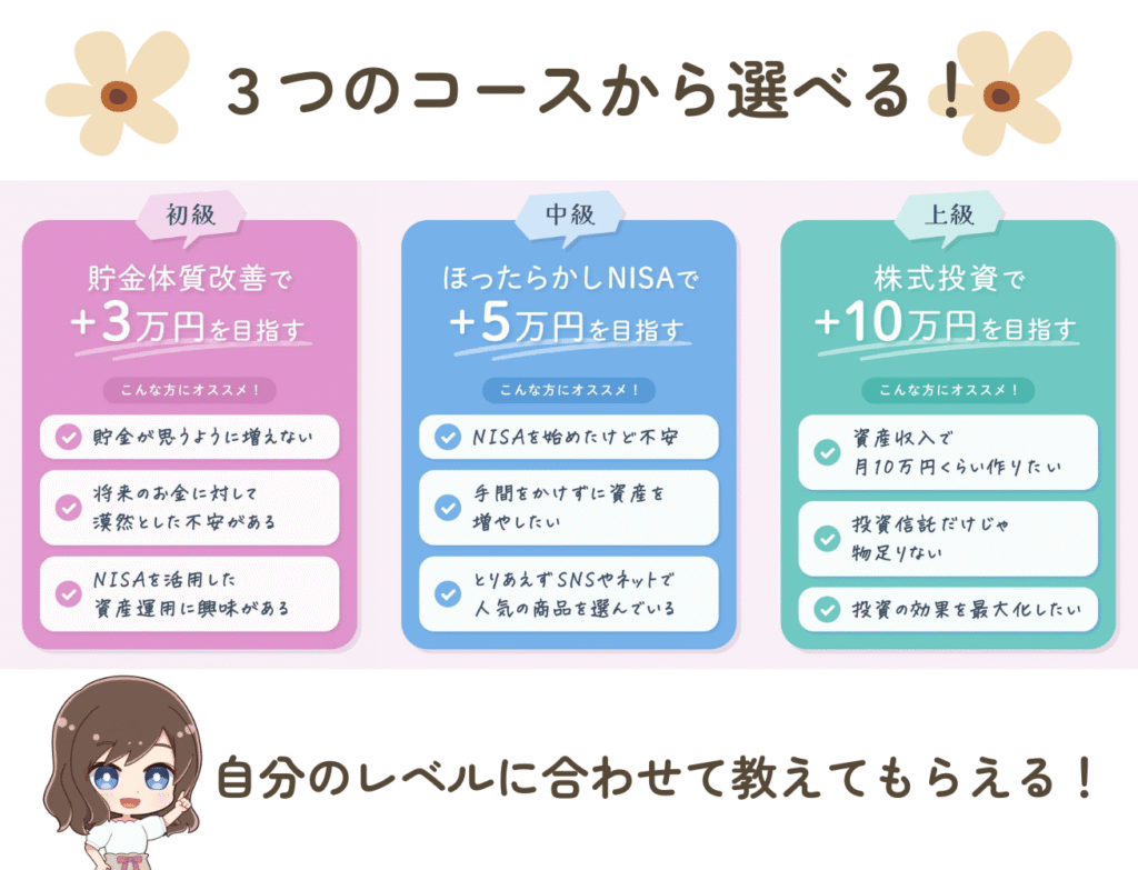 まだNISAしたことがない人から始めてる人まで自分のレベルに合わせてコースが選べるよ!オンライン、マンツーマンで詳しくNISAの活用を教えてもらえる!