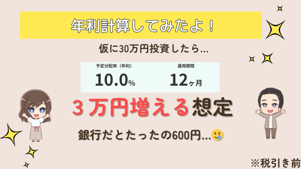 銀行だと金利が良くても1年で600円しか増えないのに3万円以上も増えるって本当うれしいよね!