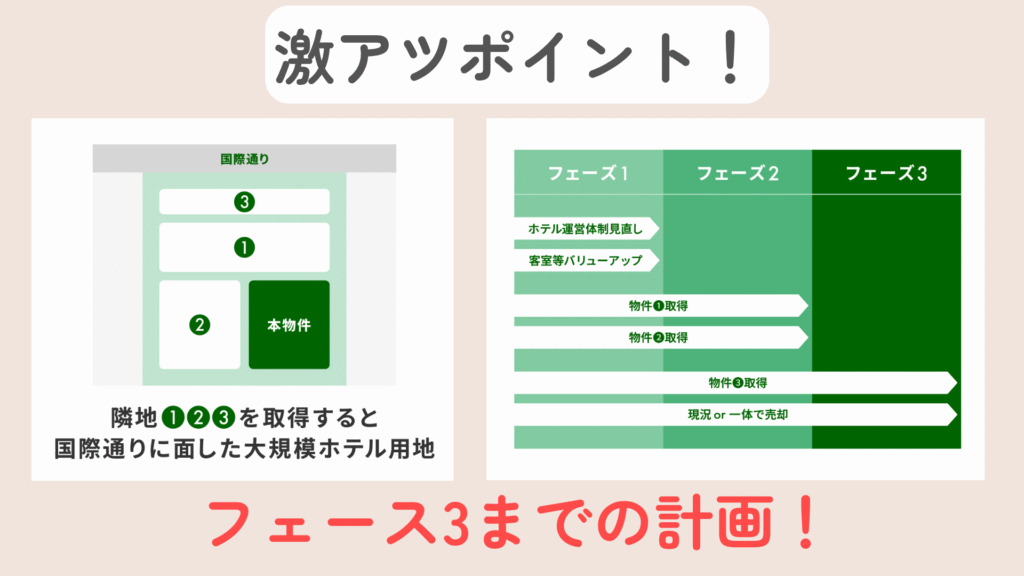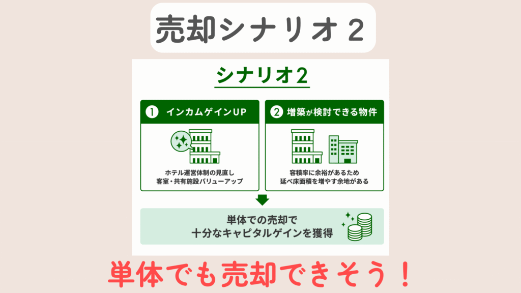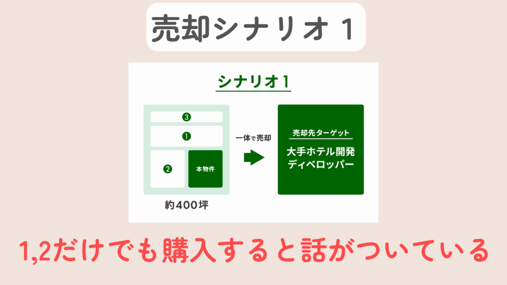 売却シナリオの理想は、一体で購入→大手ディベロッパーに売却すること。