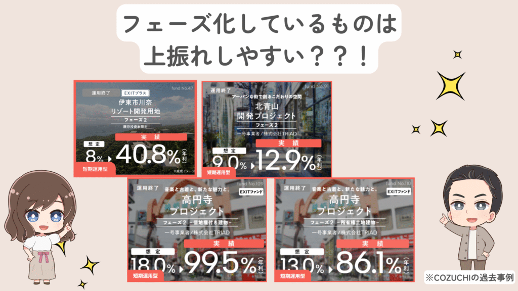 COZUCHIの過去ファンドを見ていると、フェーズ〇が付いたものは上振れる確率が高めです👀