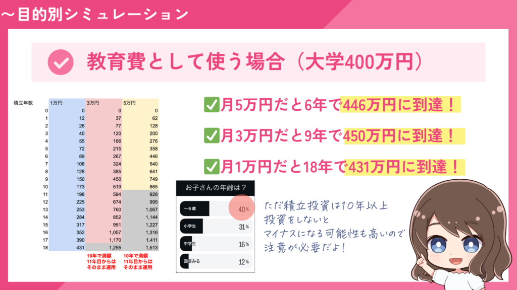 教育費って、実はこどもNISAじゃなくても対応できる場面が多いから。