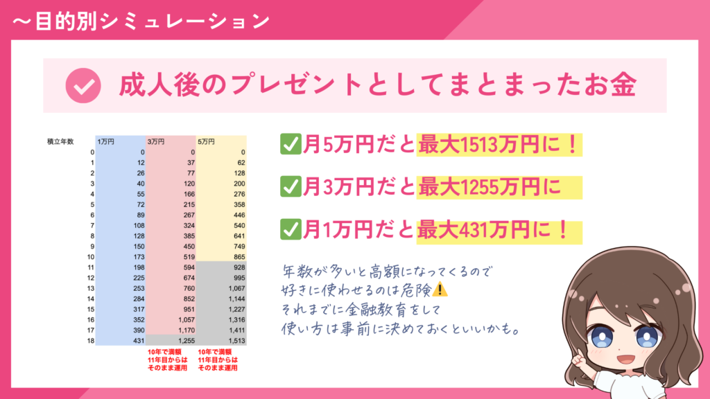 こどもNISAとして贈与できれば投資で増えた額をプレゼントできるよね🎁