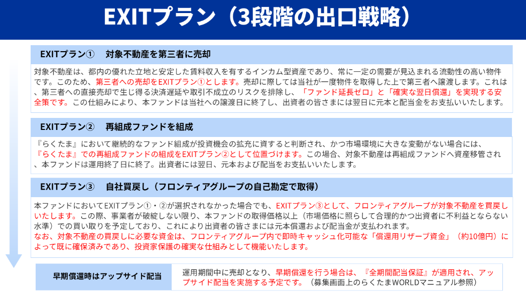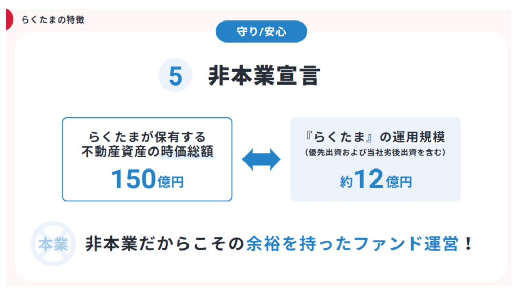バブル崩壊以降、最大の不動産価格下落となったリーマンショック時の下落率約20%(出所:国交省データ・三菱UFJ不動産販売)の水準を上回る劣後出資比率を設定し、投資元本への影響を最小限に抑えます。(らくたまHP参照)